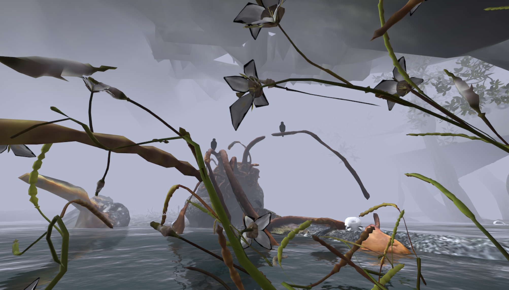 Interactive game created with New Art City; Sonic Speculative Fiction; Monitor; Computer; Keyboard; Headphones; Set of Speakers; Extension / Power Cables Natural Materials (volcanic rocks; polished sea glass; glycerin preserved Primula elatior (i.e. oxlip) specimens; lava fragments; drift wood); Books; Personal Protective Equipment; Desk and Chair; Printed Maps and Drawings