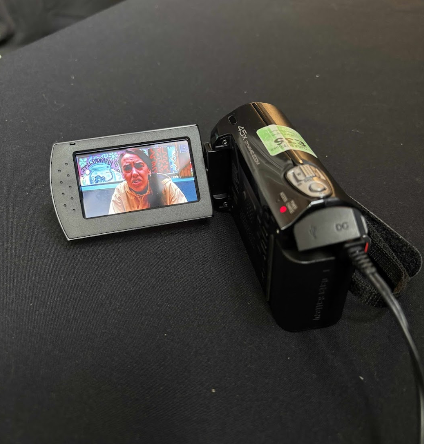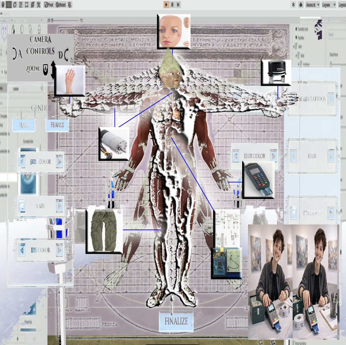 Table, chair, clothing, foam latex, silicone, human hair, arduino circuitry, protoplasm, blue orgones, burnt sage, power banks, hand stamp