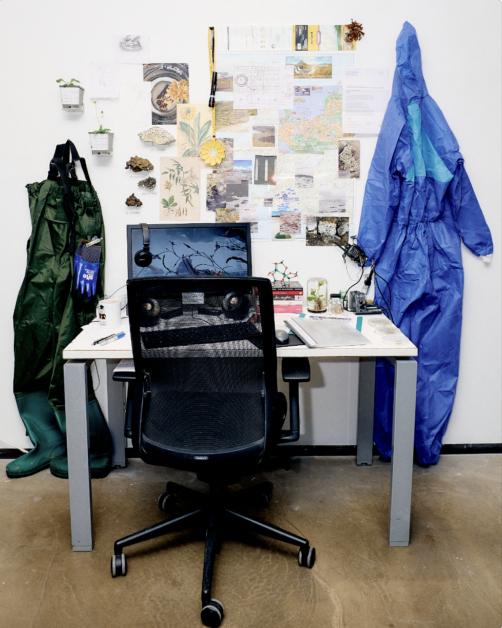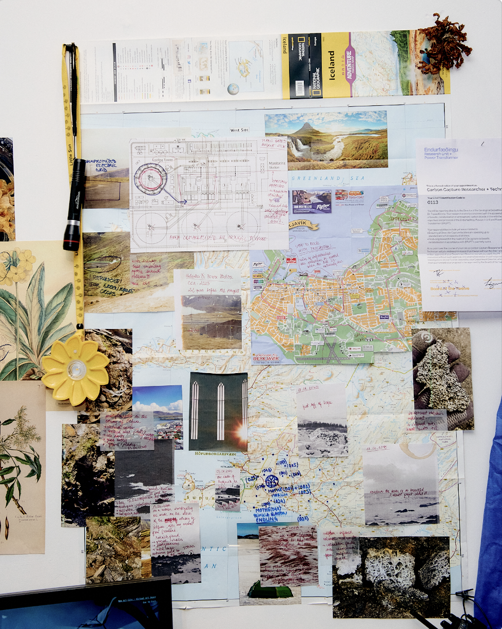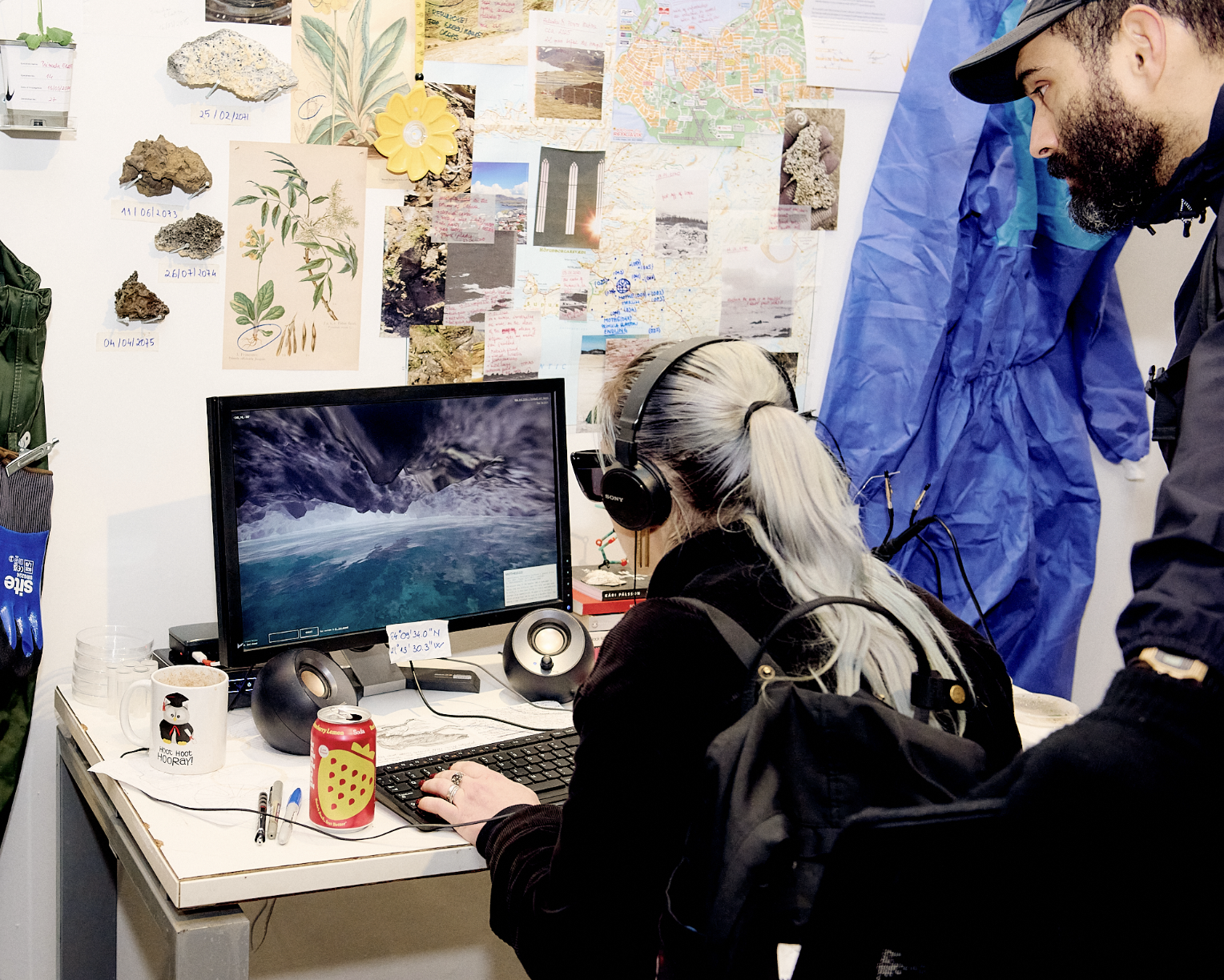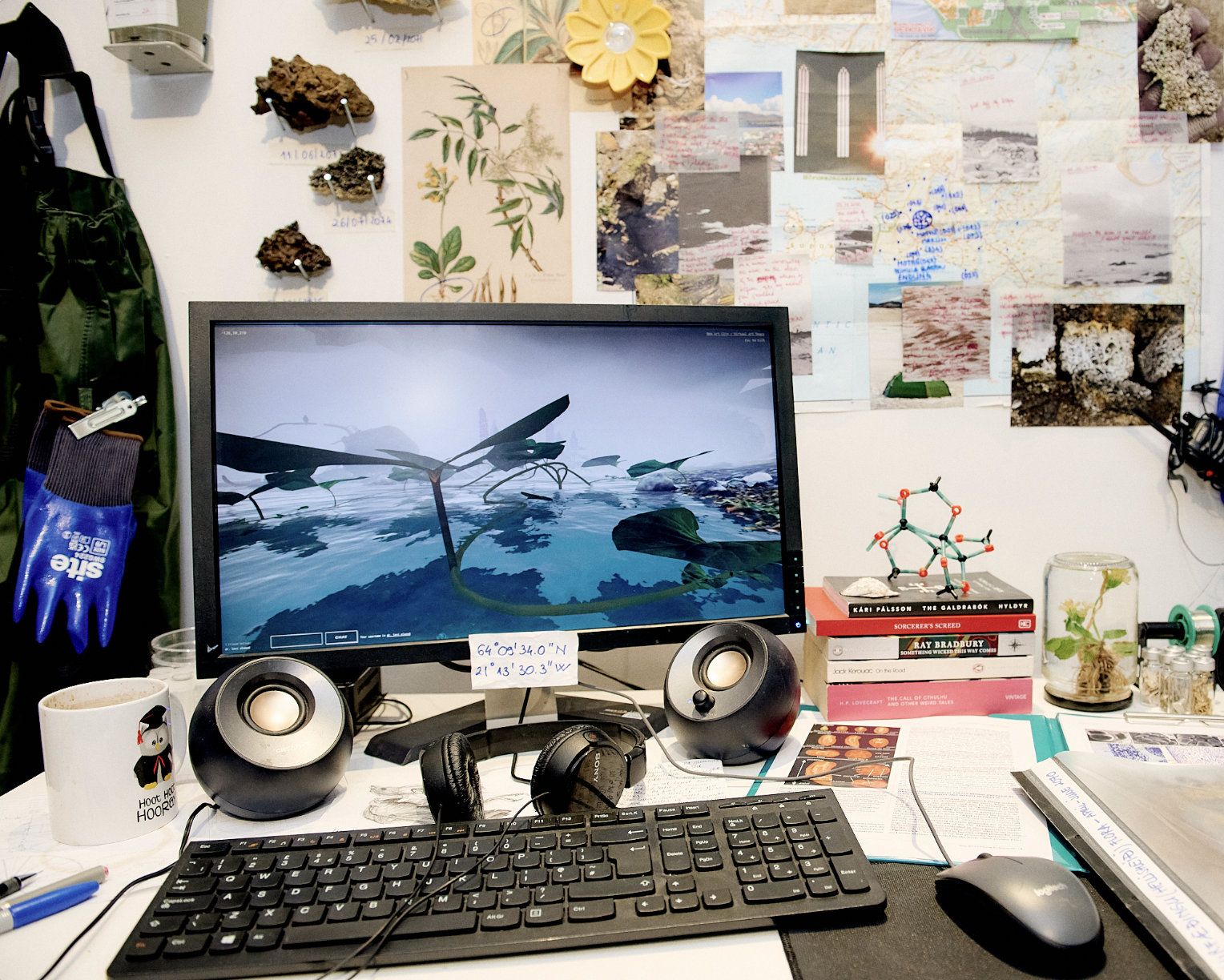 Interactive game created with New Art City; Sonic Speculative Fiction; Monitor; Computer; Keyboard; Headphones; Set of Speakers; Extension / Power Cables Natural Materials (volcanic rocks; polished sea glass; glycerin preserved Primula elatior (i.e. oxlip) specimens; lava fragments; drift wood); Books; Personal Protective Equipment; Desk and Chair; Printed Maps and Drawings