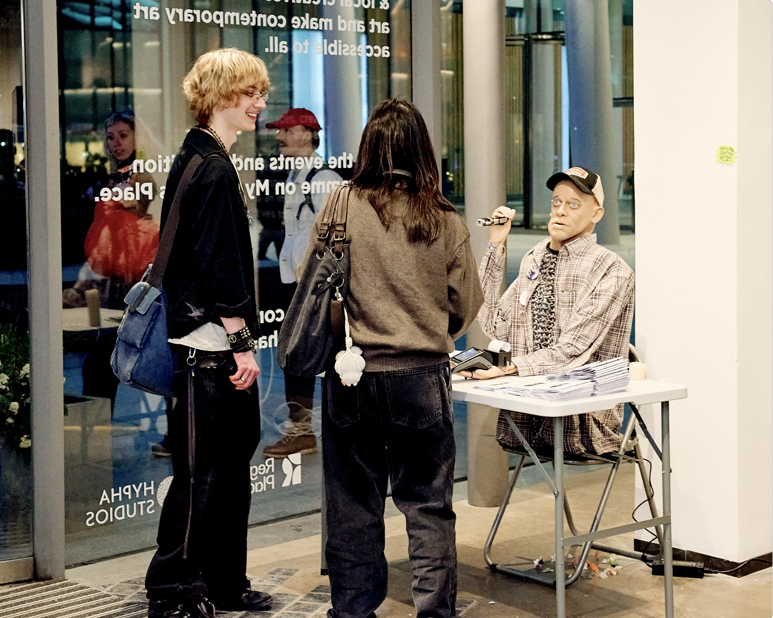Table, chair, clothing, foam latex, silicone, human hair, arduino circuitry, protoplasm, blue orgones, burnt sage, power banks, hand stamp
