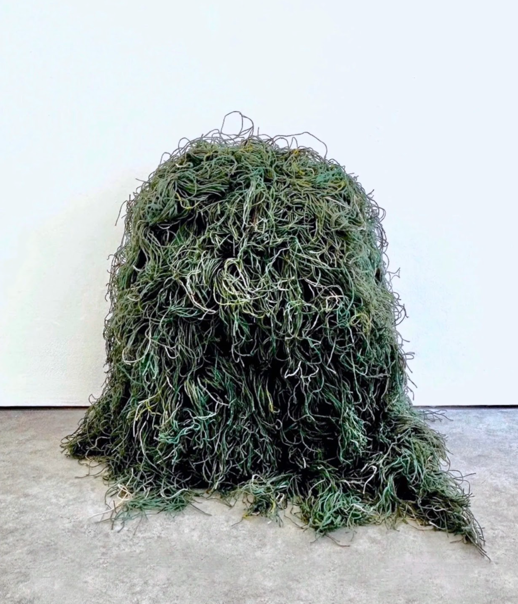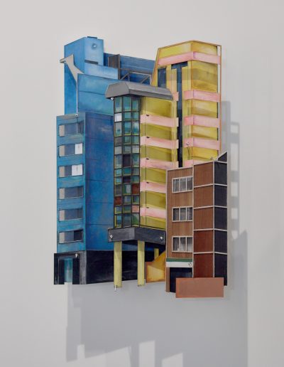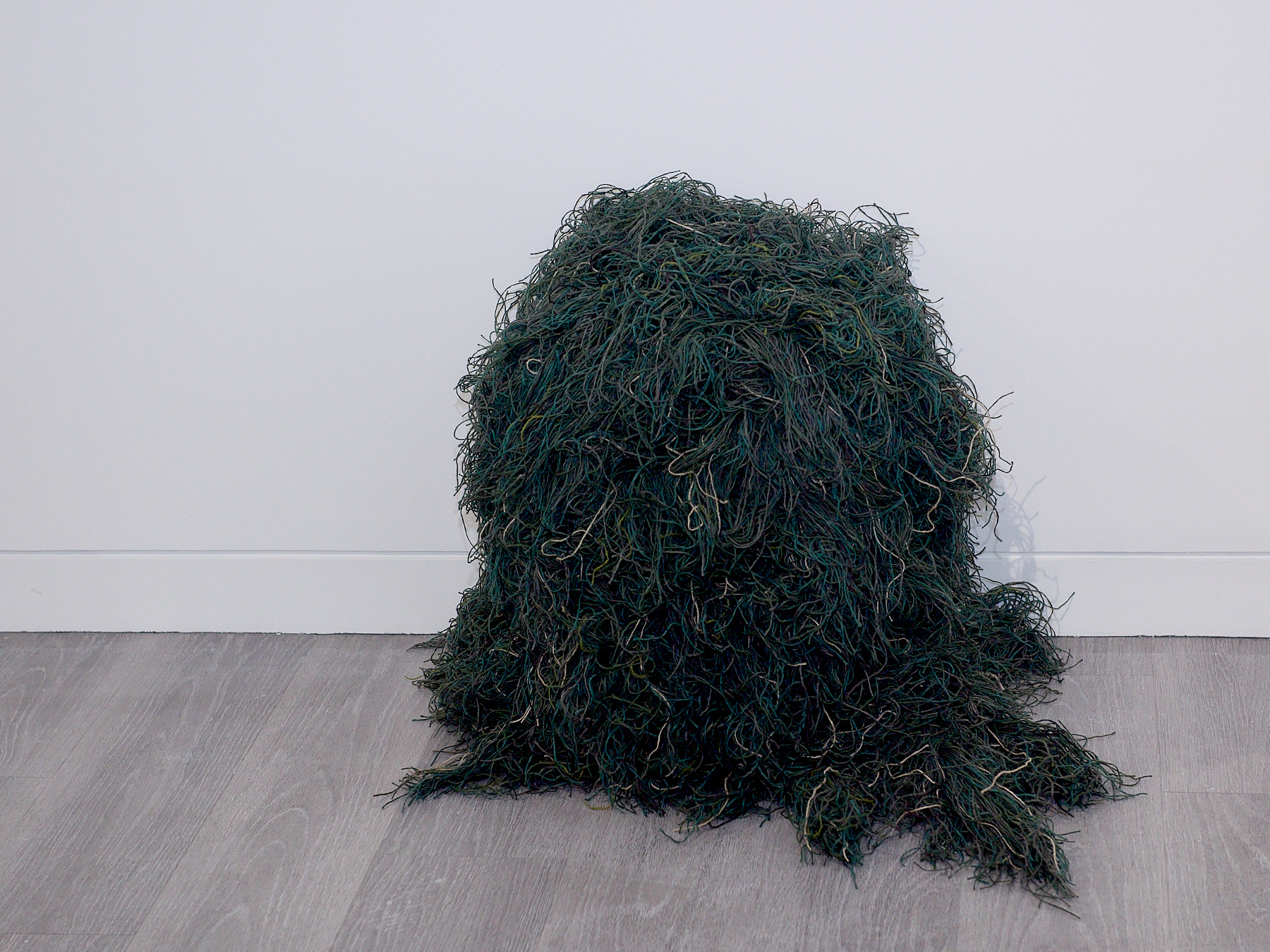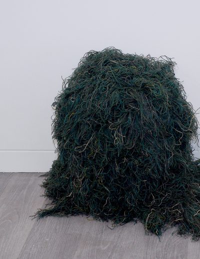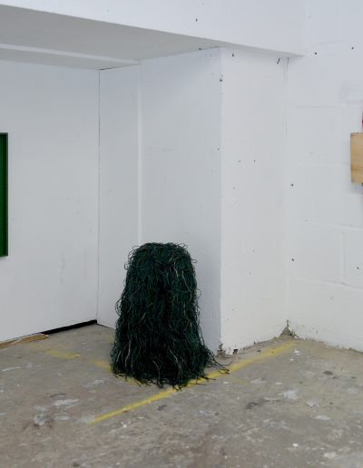 Found cardboard, elastic, synthetic string, found fabric, adhesive