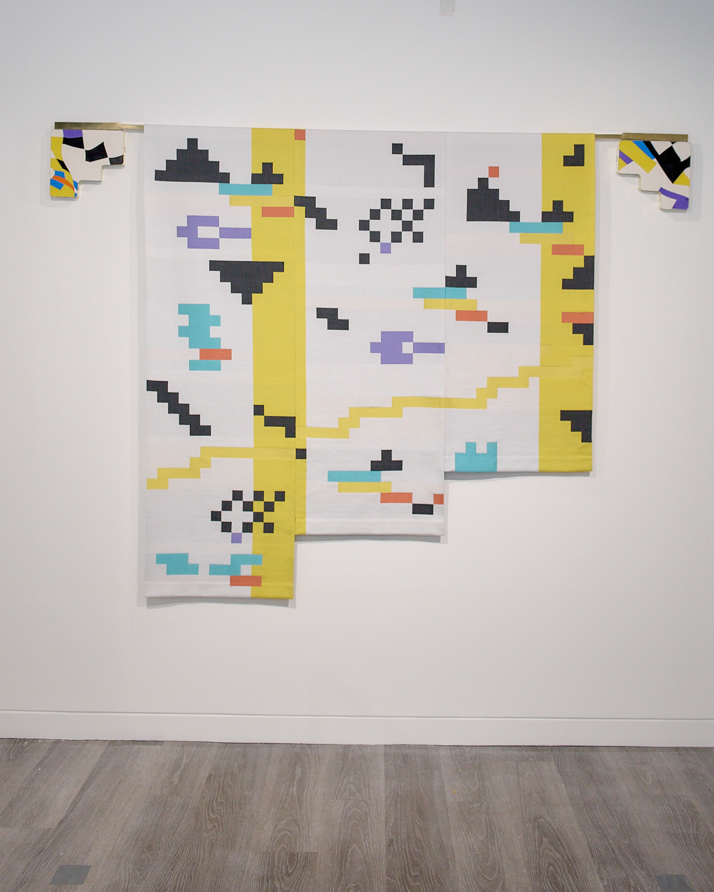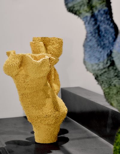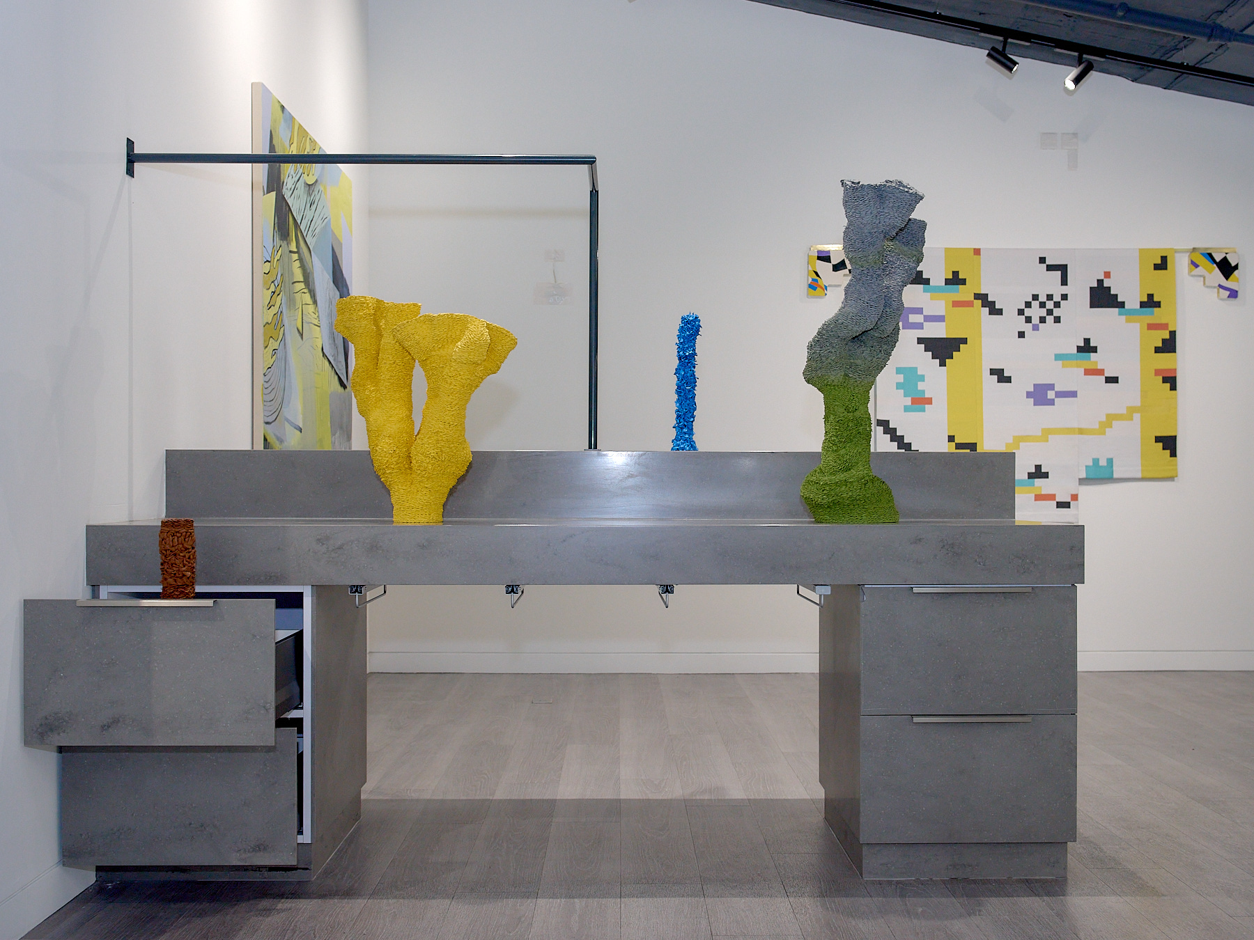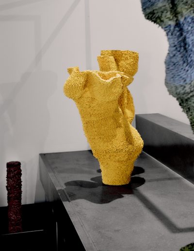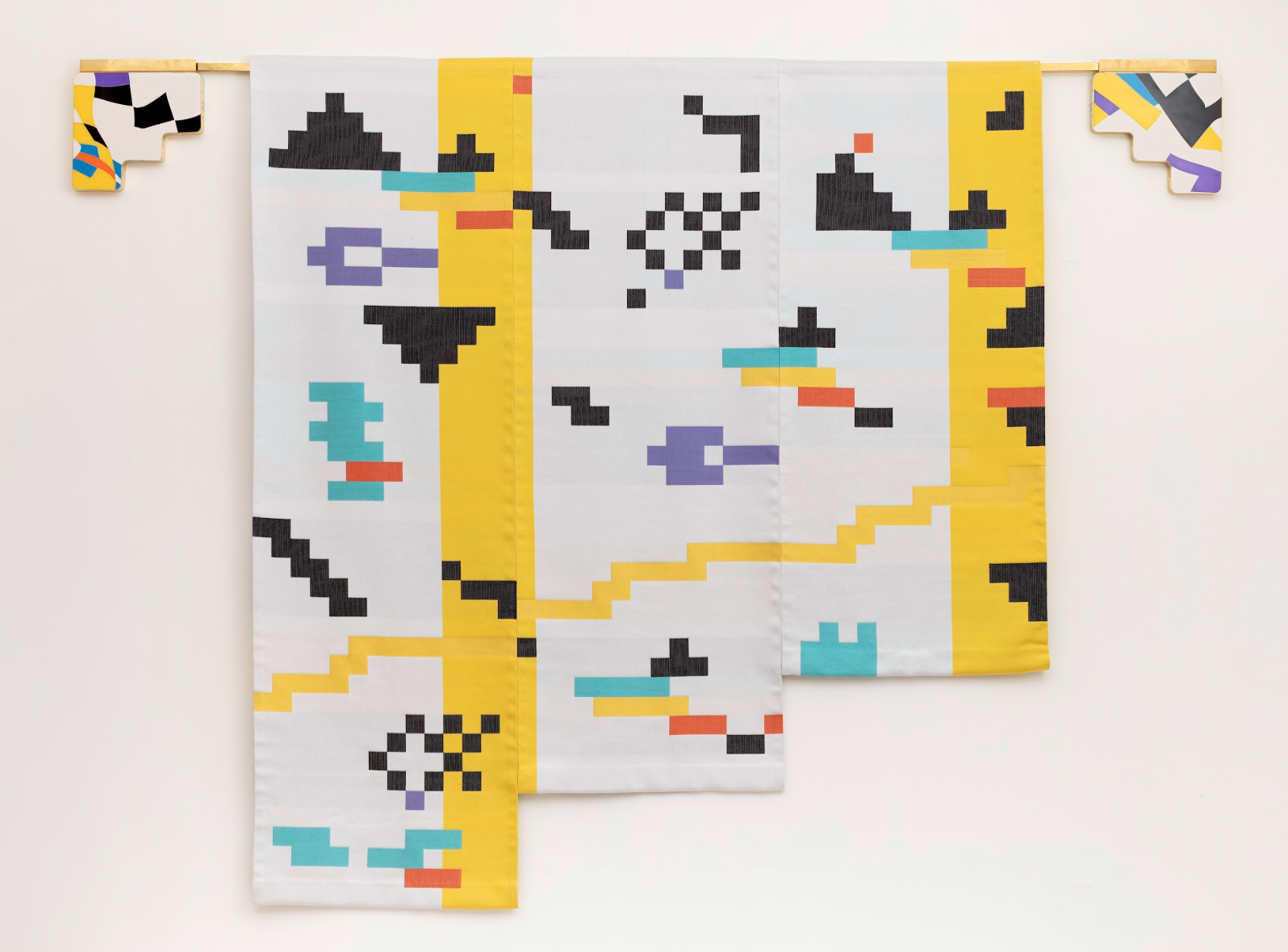 Hand woven silk and Tencel, Jesmonite, Perspex, brass, lead weights