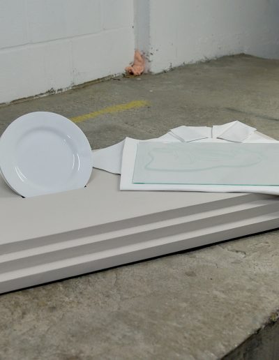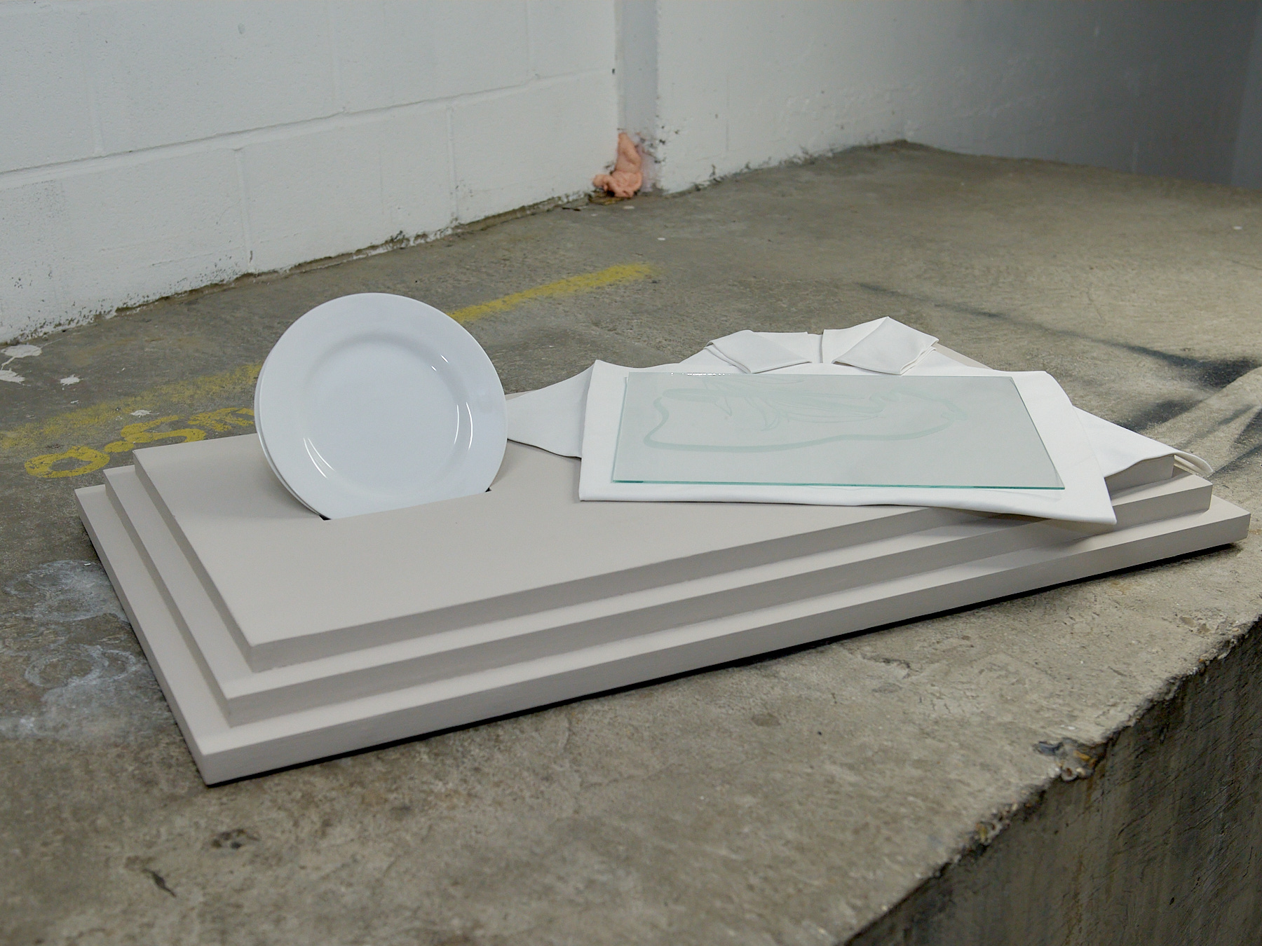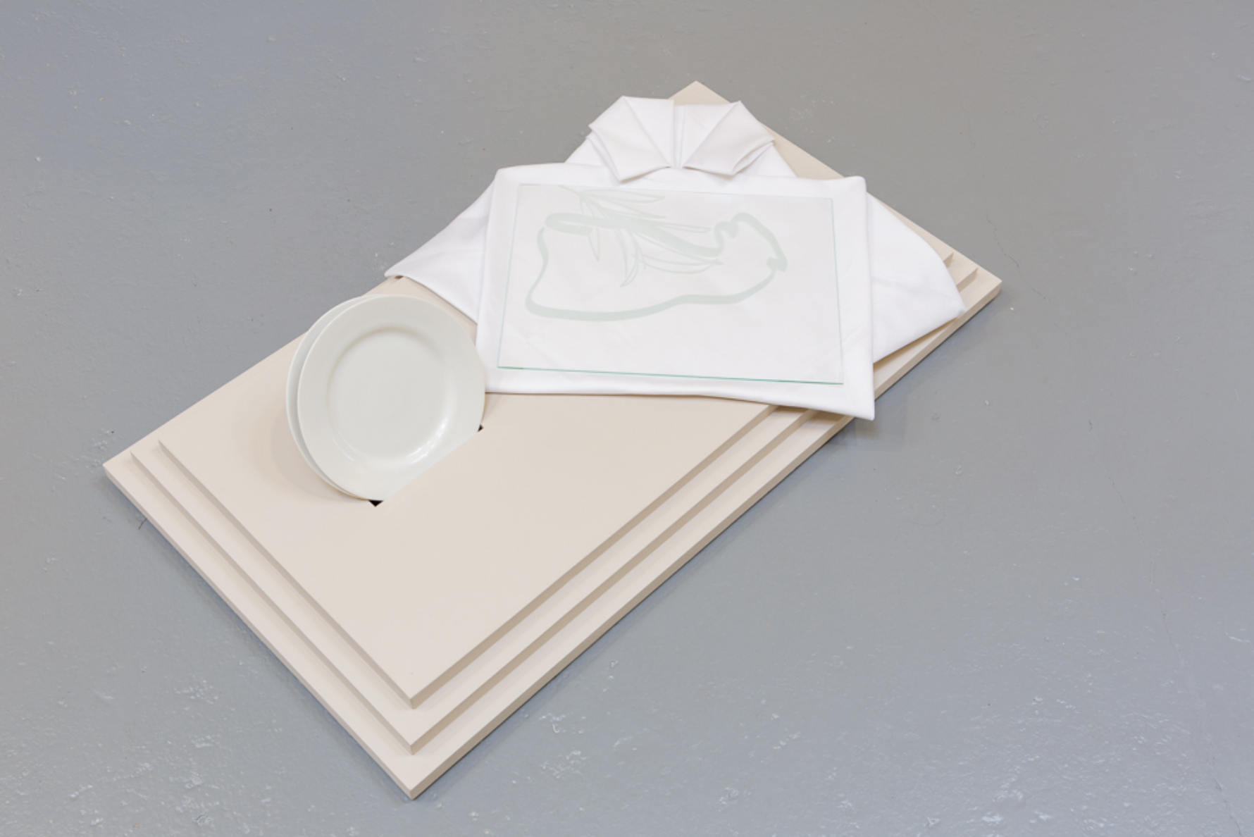 Wood, plates, tablecloth, sandblasted glass