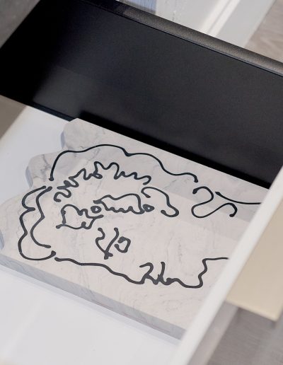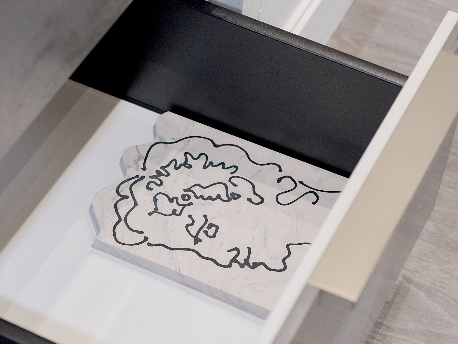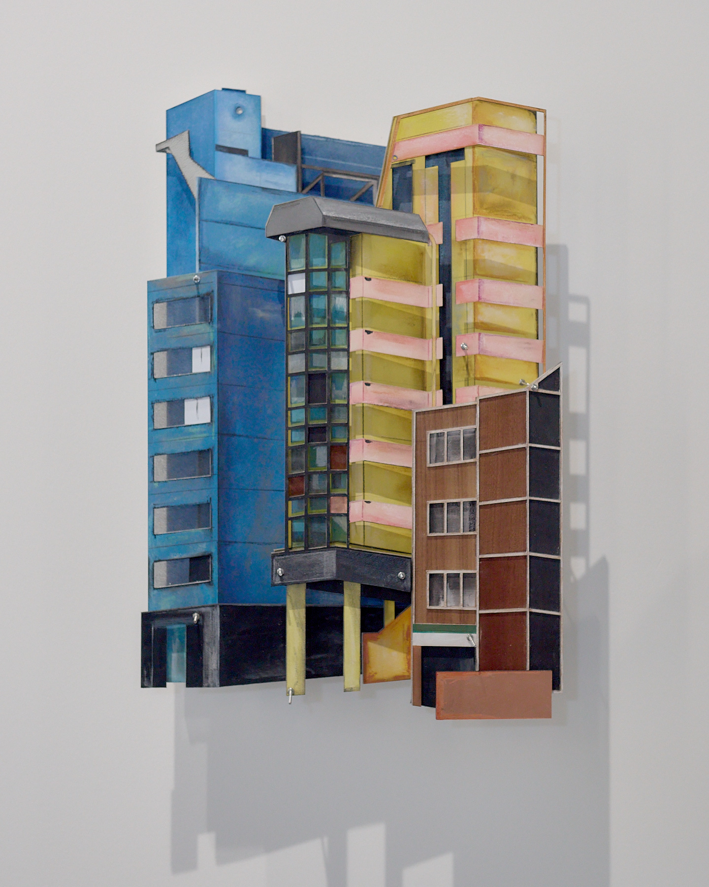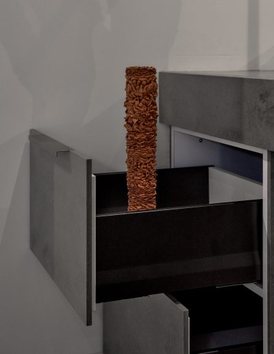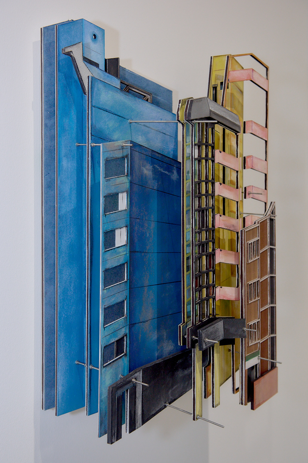 MDF, emulsion and watercolour paint, wood veneer, leather, suede, polypropylene, copper sheet, charcoal, chalk pastel, pencil, coloured and watercolour pencil, carbon veil, copper coated carbon, faux leather, stainless steel threaded bar, nuts and bolts