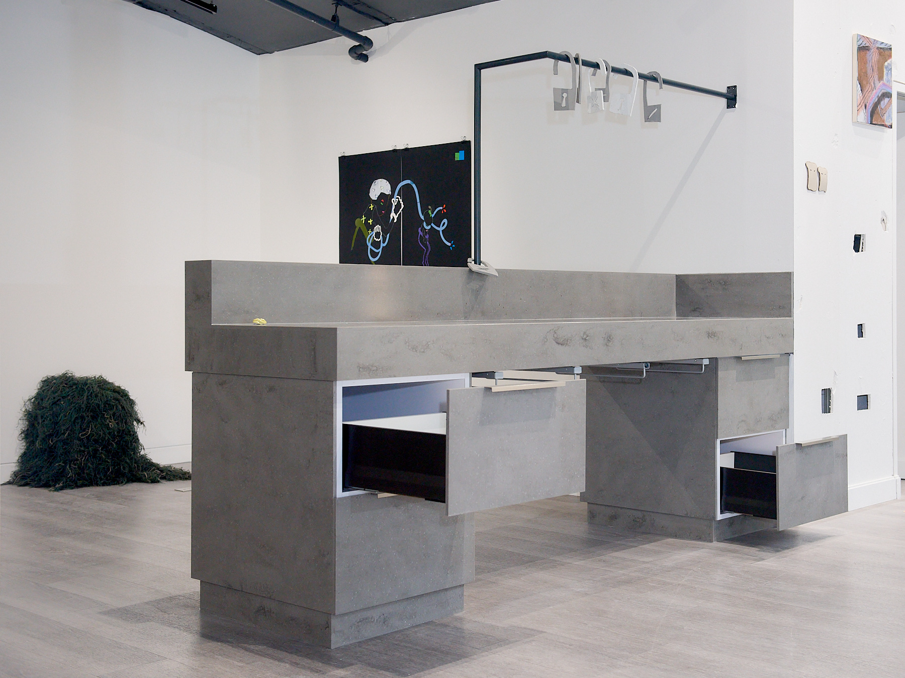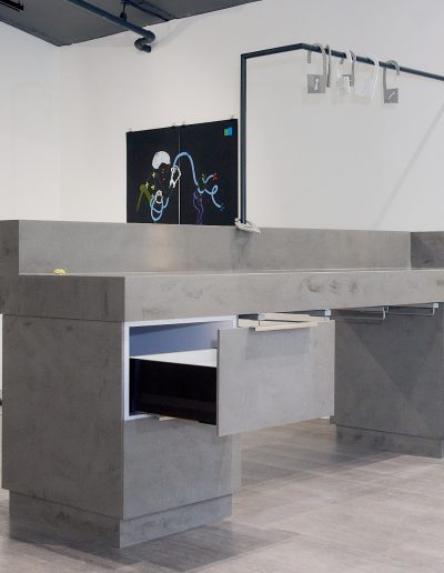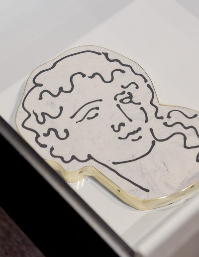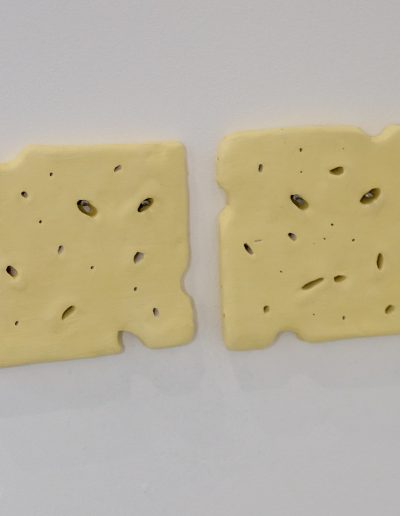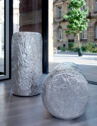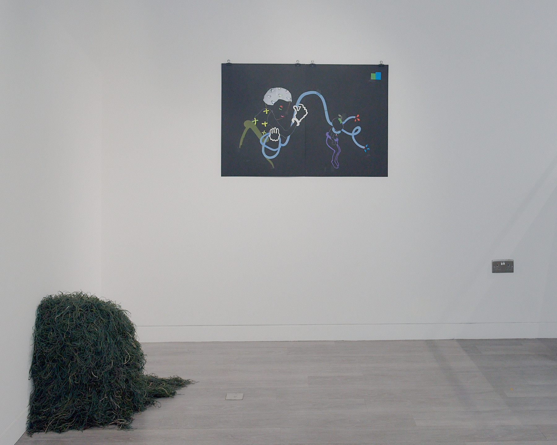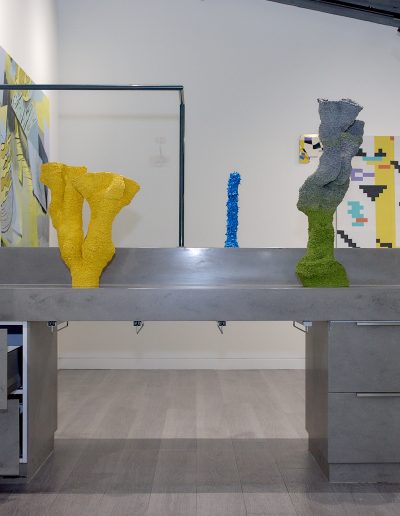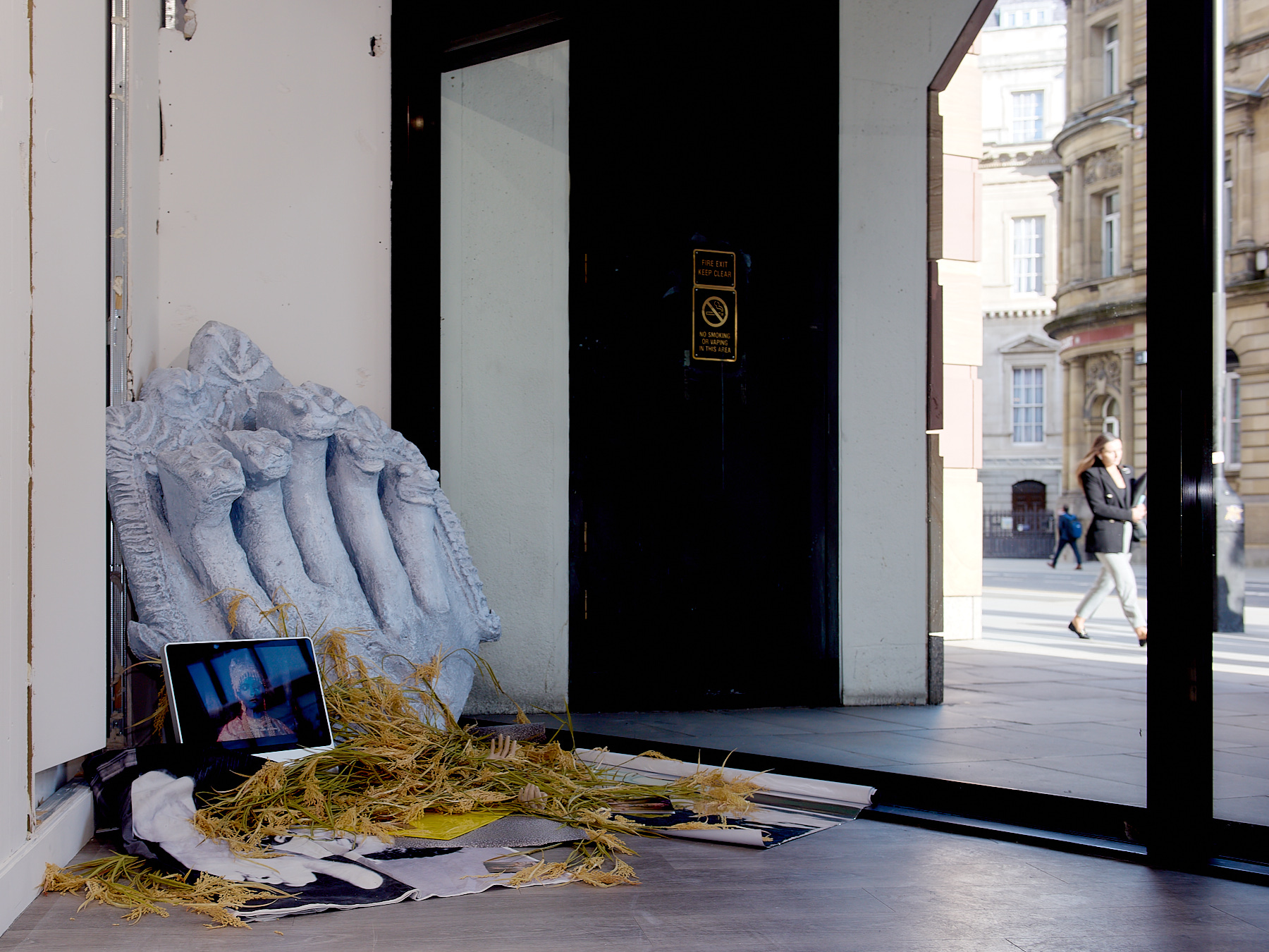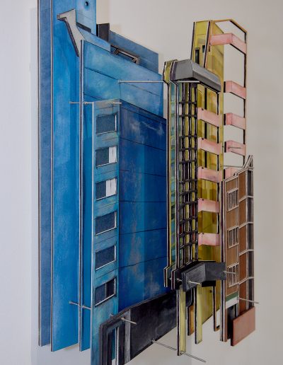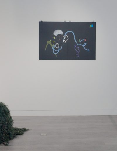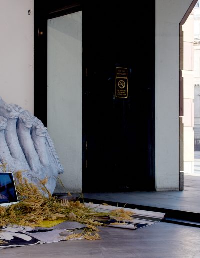The exhibition brings together existing and newly created works in a range of media including painting, installation, moving image and sculpture at the magnificent No. 1 Poultry building in the heart of Bank in which artists have been invited to play with a full spectrum of grandeur, from the grossly theatrical to the boldly mundane. The exhibition draws inspiration from the anti-hierarchical and broad influence of the postmodern style epitomised by James Stirling’s architectural design which exudes a functional and somewhat excessive presence – a material attention seeker in a sea of normality. The exterior recalls Egyptian pyramids, cruise ships and Mediterranean villas while the interior space of Gallery 3 retains elements of its previous use as a gym in which users wore costumes that deliver electric shocks to muscles during exercise. This unusual mirrored setting is an energetic and eclectic space in which to welcome community and dialogue with fellow artists and locals in this distinctive location.