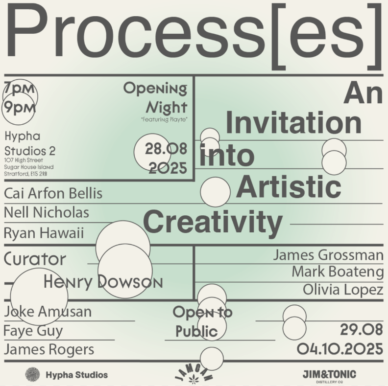 Processes] invites you into the world of artistic creativity, through an exploration of artistic process. Nine contemporary artists will present a selection of work, alongside sketches and preparatory ideas, to show their own creative process in the creation of their art. These artists are Joke Amusan, Cai Arfon Bellis, Mark Boateng, James Grossman, Faye Guy, Ryan Hawaii, Olivia Lopez, Nell Nicholas, & James Rogers.