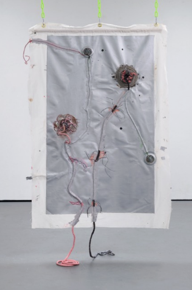 Acrylic paint, acrylic ink, string, calico/canvas, grommets, plastic chain