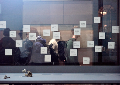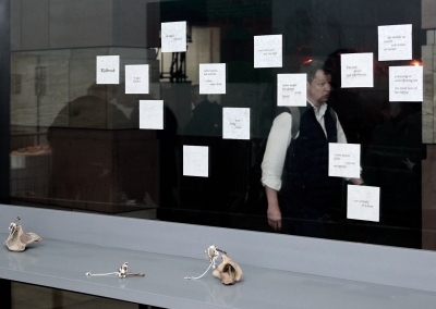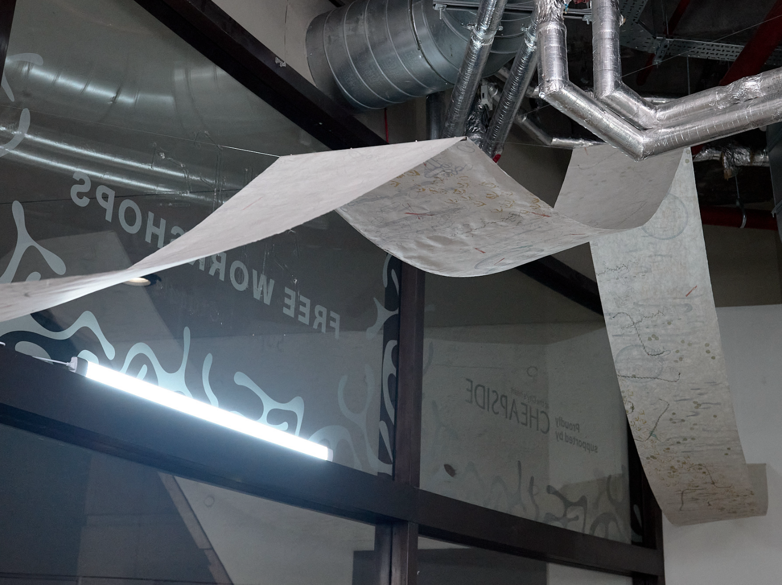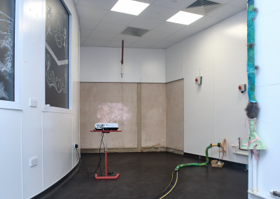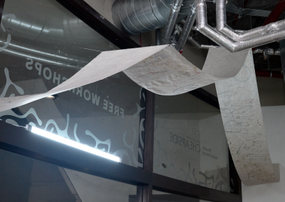 A communal workstation in the gallery will remain active throughout the exhibition, allowing artists to continue developing new works in conversation with the site’s histories and in conversation with visitors to the gallery. The artists will engage with different audiences through a local walk following the course of the Walbrook River with Mark Sowden, a demonstration of ink-making from found materials with Sam Hodge, and artists’ talks in the gallery.
