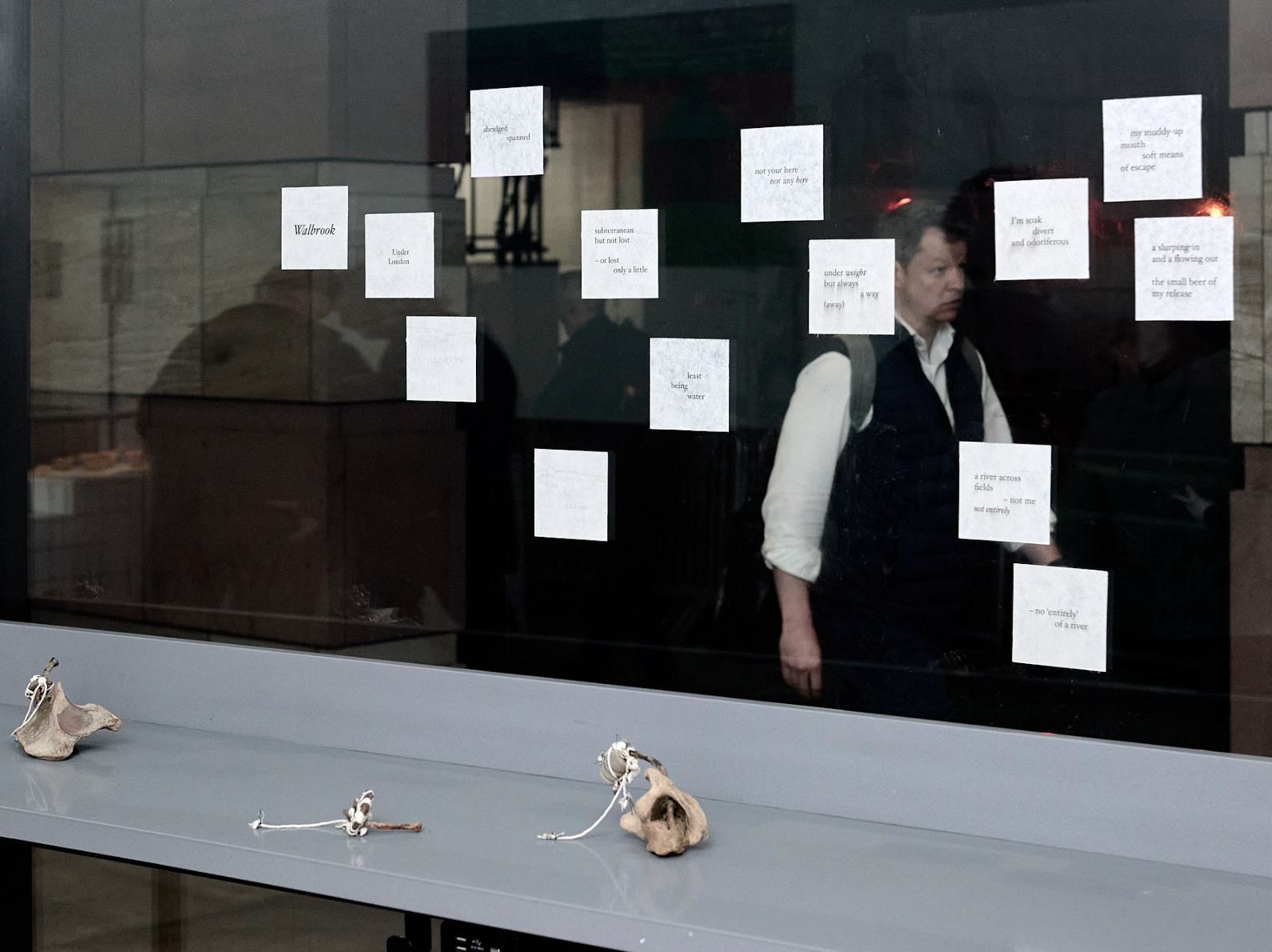 Some of the artists engage directly with the material presence and/or history of rivers, including Madi Acharya-Baskerville’s assemblages of river-found objects, which are intertwined with her South Asian heritage; Sam Hodge’s monotypes made from inks she makes from river materials; Jim Roseveare’s sculptural response to the encasement of streams; and Mark Sowden’s site-specific installation. Other works explore more poetic dimensions of the theme: Tracy Hill’s site specific drawing points to invisible landscapes, while Matthew Swift’s mixed-media installation imagines “inner rivers.” Tom Banks’s new paintings will respond to the broader area around 1 Poultry and the former path of the river, as will a text- based piece by poet Mike Sims. Finally, the exhibition confronts the ecological fragility of our waterways, with Joost Gerritsen’s elegiac film about a dried-up river and Marcia Teusink’s screenprinted scrolls looking at the pollution of rivers.