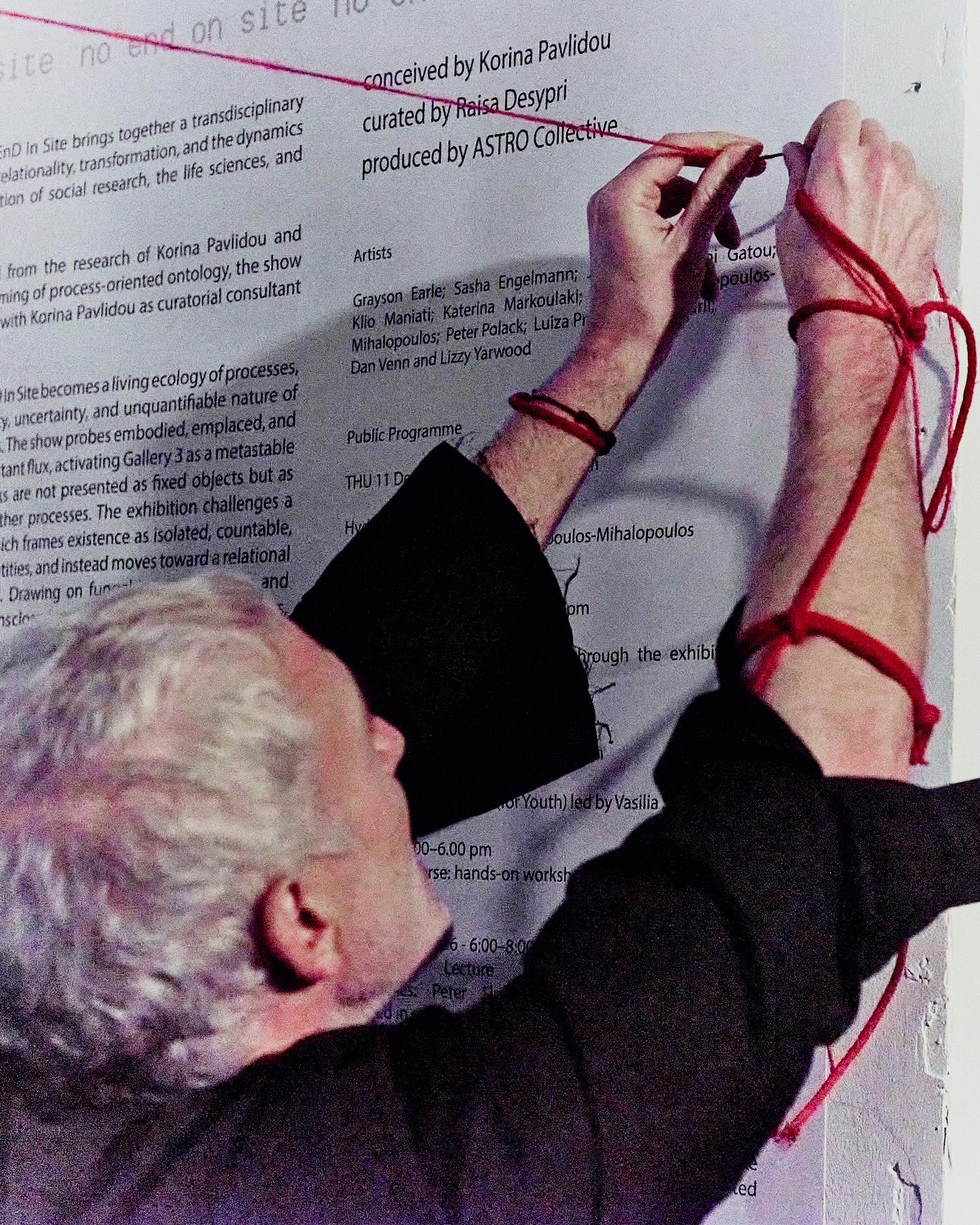 Processing Process ~ No EnD In Site brings together a transdisciplinary group of artists exploring relationality, transformation, and the dynamics of process. Conceived from the research of Korina Pavlidou and articulated through her framing of process-oriented ontology, the exhibition is curated in collaboration with Raisa Desypri and produced by ASTRO. The show features artists Grayson Earl, Sasha Engelman, Jonn Gale, Ismini Gatou, Klio Maniati, Katerina Markoulaki, Andreas Philippopoulos-Mihalopoulos, Peter Polak, Luiza Prado, Xristina Sarli, Dan Venn, and Lizzy Yarwood.