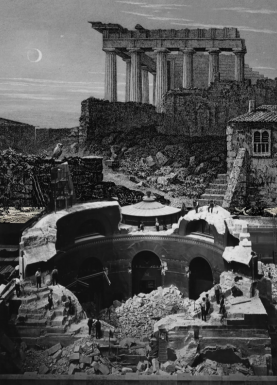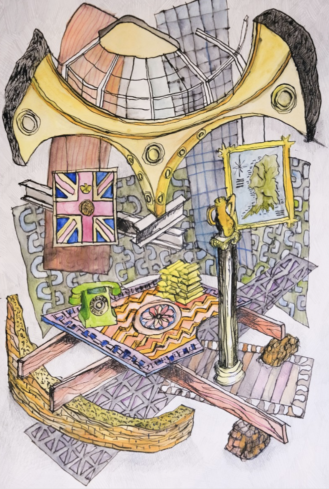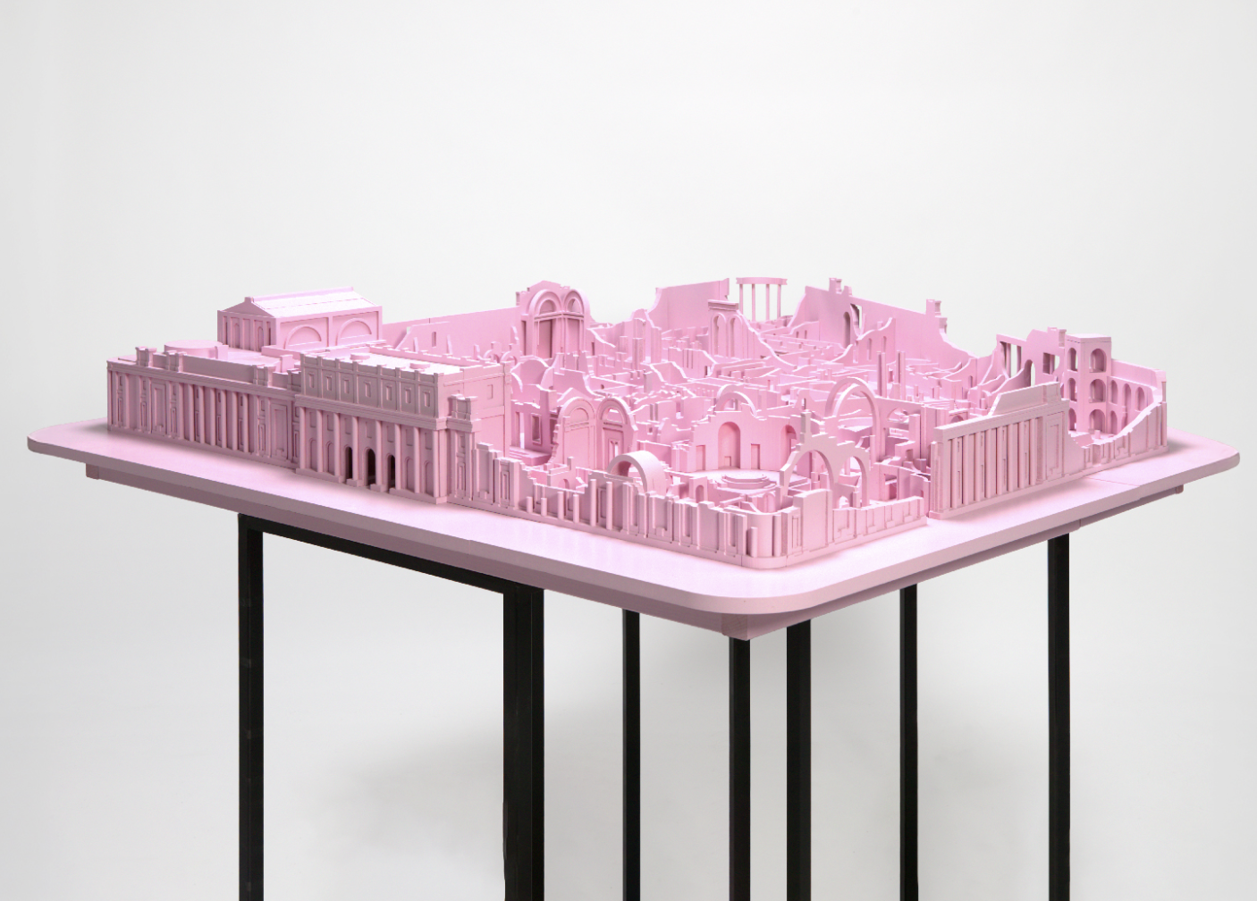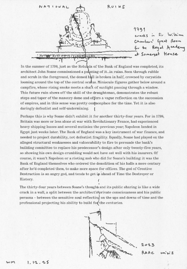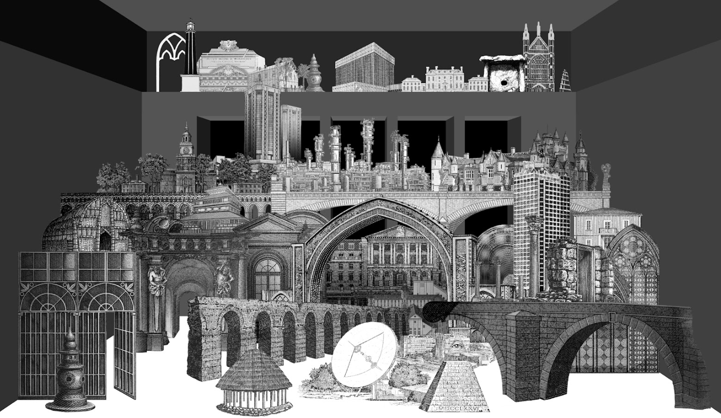 The strangeness of depicting architecture (and a key edifice of the British state) as a ruin is the starting point for a collection of different projects. These also respond to Soane and Stirling’s interest in fragmentation and reassembly, the reuse of pieces of history to construct possible futures.