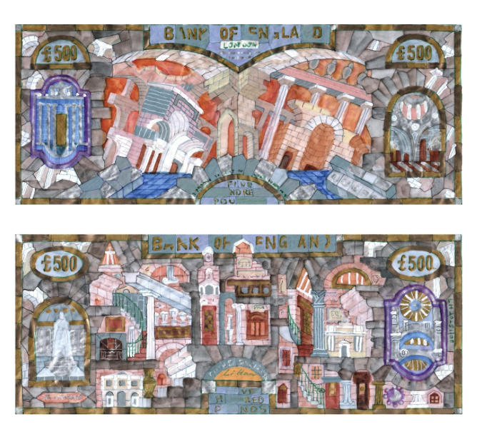 • Drawings of the architectural fragments used in the design of bank notes, where buildings are used as symbols of both solidity and state.