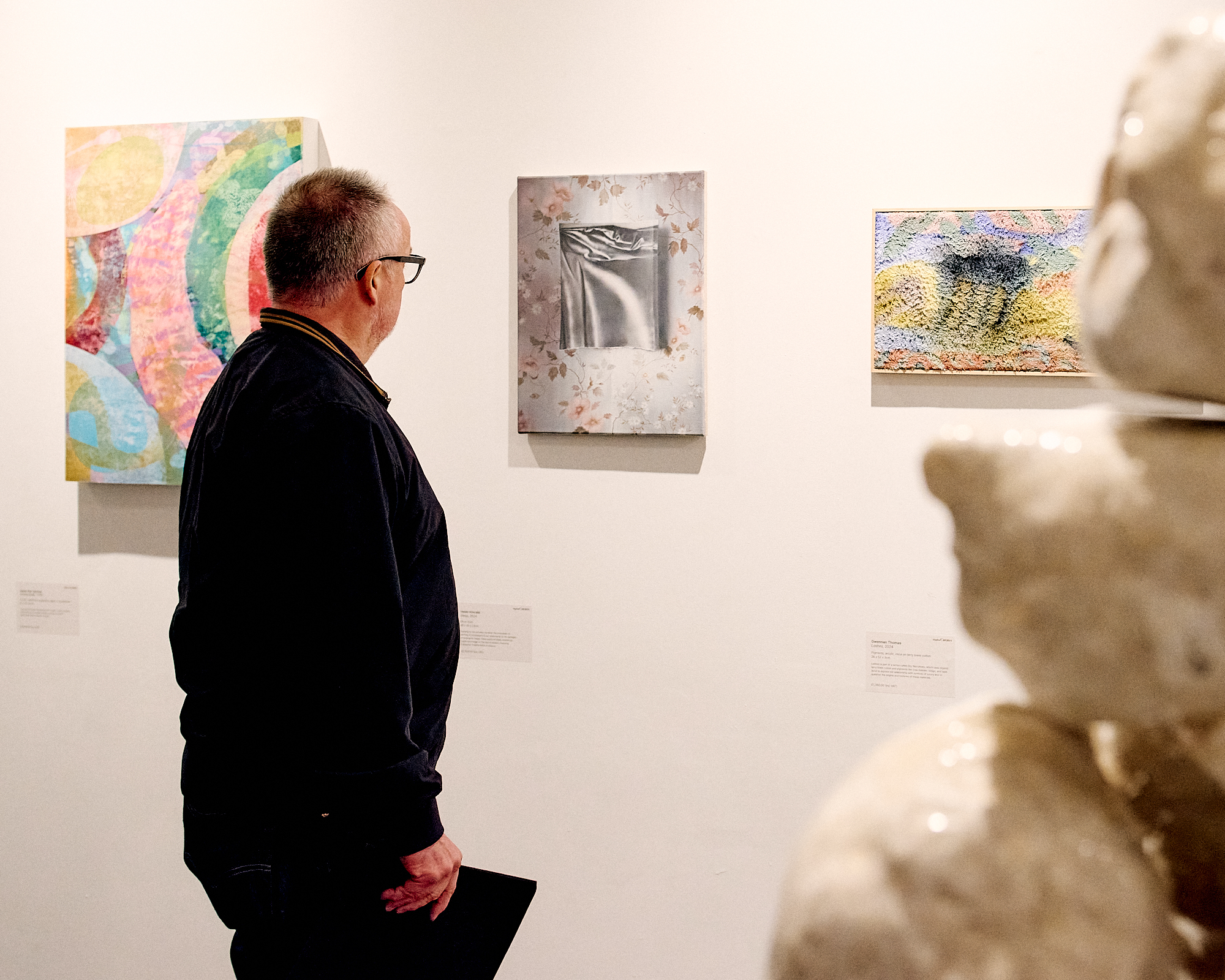 Some exhibited artists foreground hands-on engagement with materials such as clay, textile, glass, or cardboard. Here, making is visible and each medium is exploited for its intrinsic properties – clay’s pliability and sensitivity to heat, or cardboard’s rigidity and its application in model making, for example. Practices grounded in haptic processes such as plaster casting, embroidery, carving, or trompe l’oeil painting, underscore the role of time and labour. They are knowing rejoinders to the disembodied and apparent ease of digitally produced imagery and virtual experience.