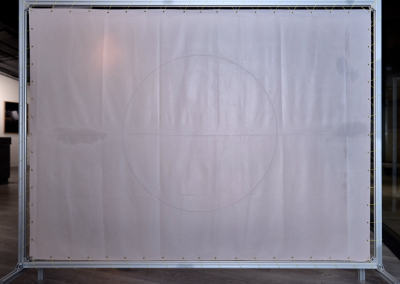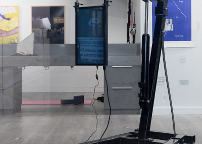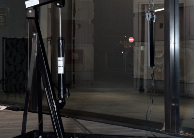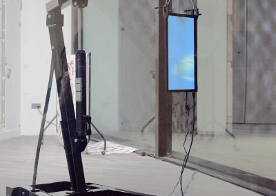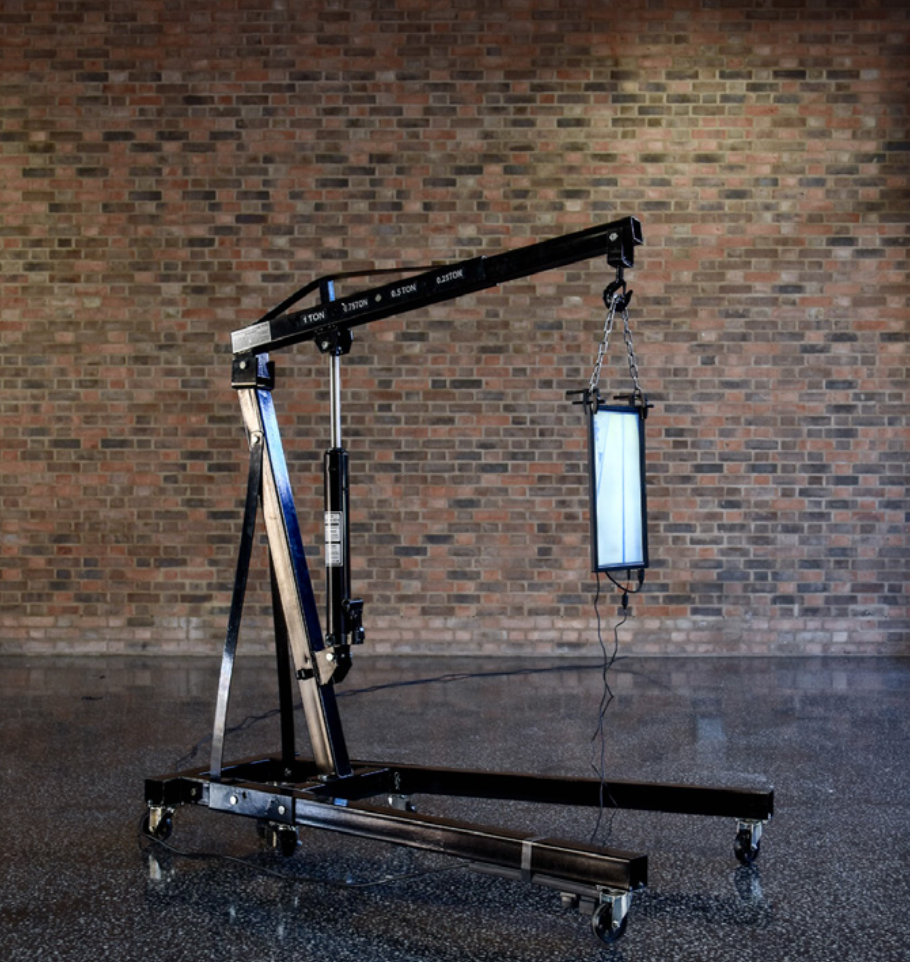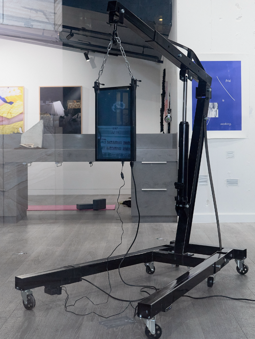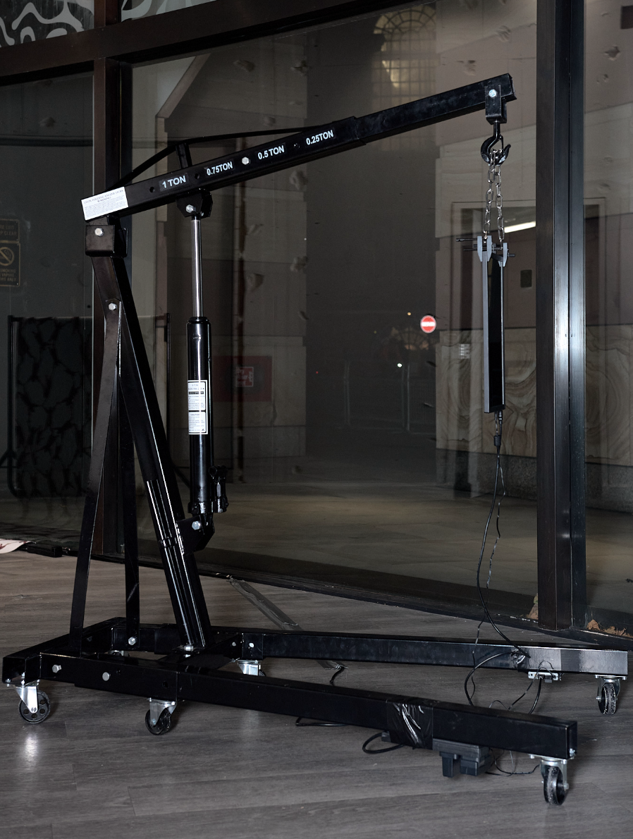 Engine crane, portable screen, metal chain, toolmaker’s clamps, single-channel video loop with sound