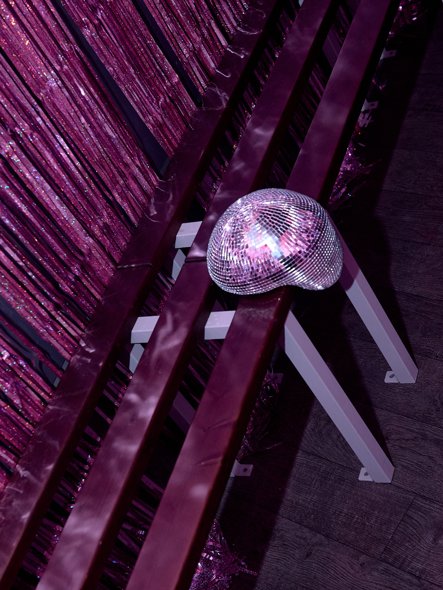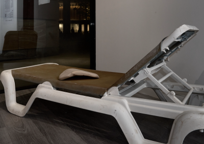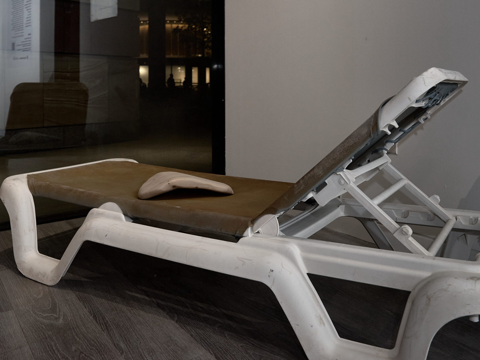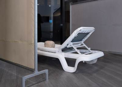 Hand-chiseled tactile sculpture made from off-cuts of wood, decommissioned sun loungers, memory foam, wipeable textile