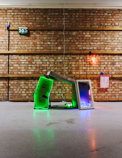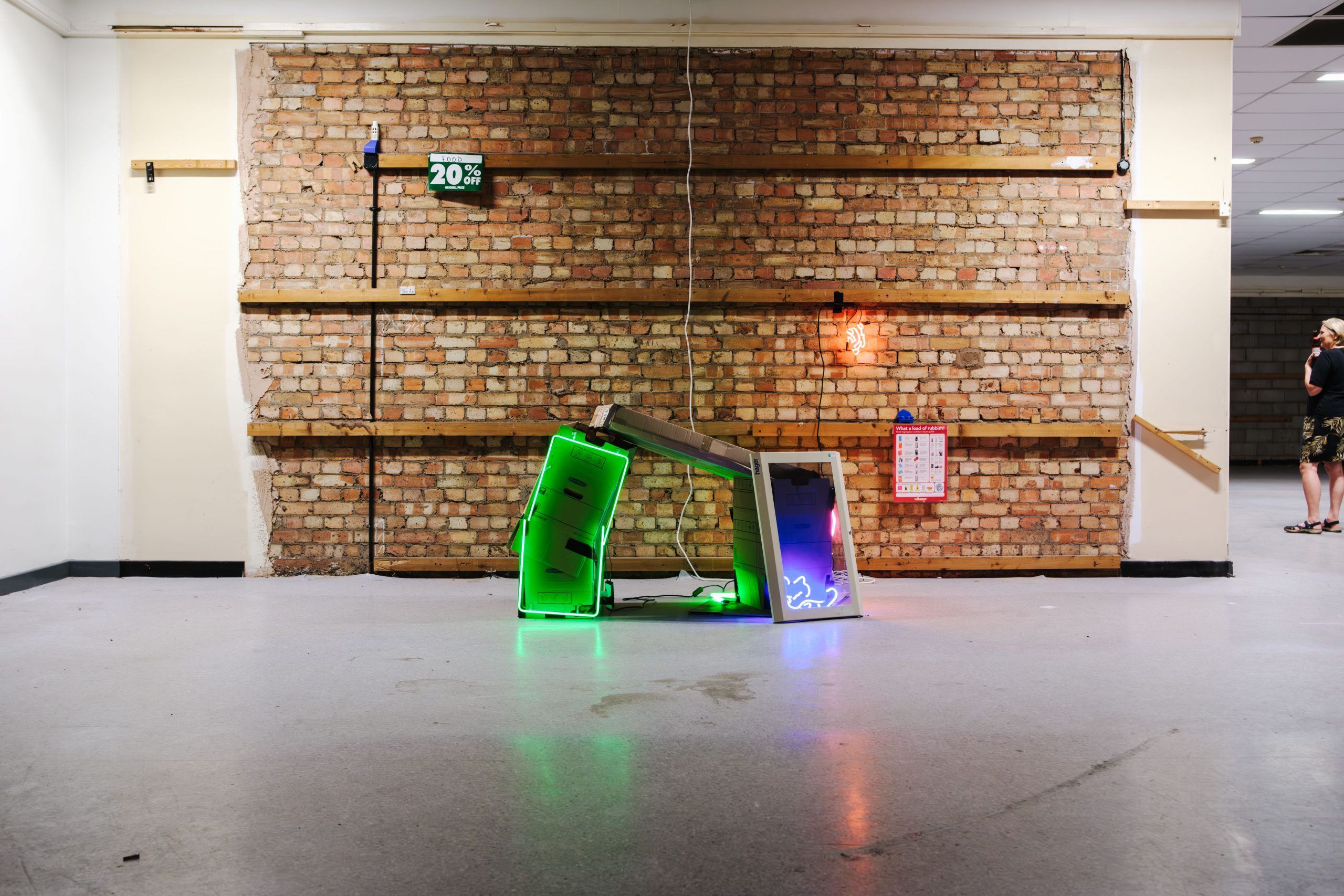 “Checked out” is an exhibition taking place in a former Wilkos in Hillsborough. Through reclamation and reoccupation, the site acts as a catalyst for seventeen artists’ works: to respond and inform. Journey through the shop floor; artefacts conjure memories and foretell uncertain futures. An emptiness echoes throughout, with reverberations of late stage capitalism.